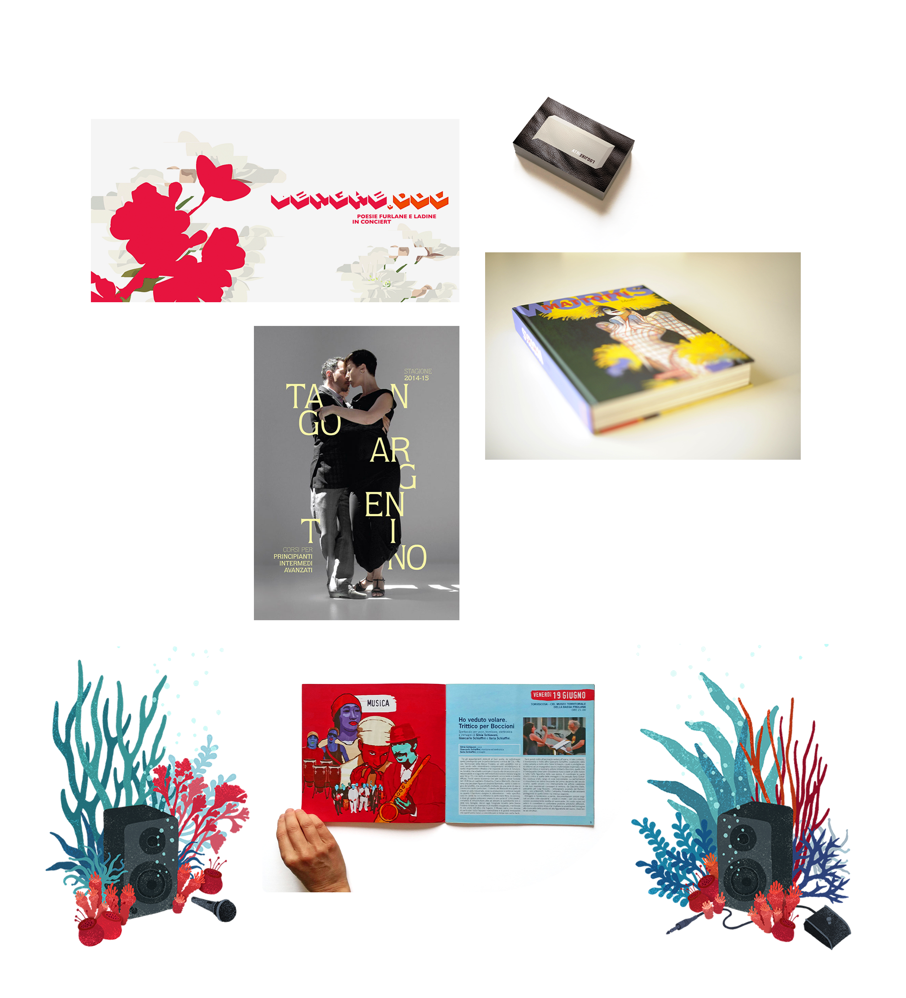I worked as graphic designer for festivals (Udine Jazz, Onde Mediterranee), institutions (Galerie Martel, INRIA, or Circolo Arci Zoo), and music projects, combining typography with custom illustrations to create unique visual identities.